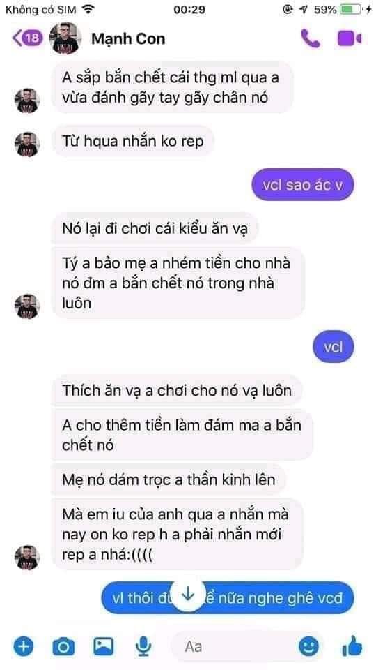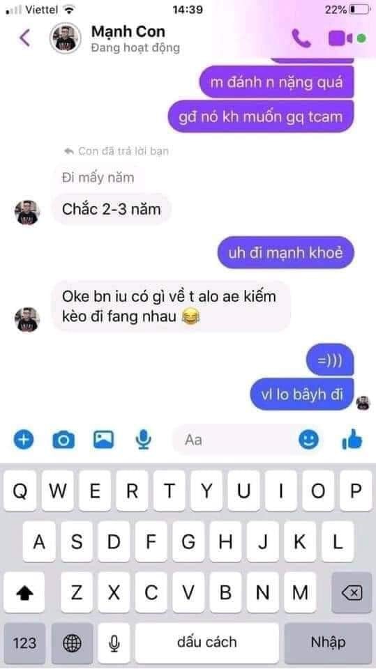 Chưa dừng lại ở đó, ngay sau khi hành hung, bạn nam này còn ngang nhiên nhắn tin với bạn khoe ‘chiến tích’ của mình. Mạnh chấp nhận mức án tù 2-3 năm và khẳng định sau khi ra tù sẽ tiếp tục đi ‘phang nhau’ tiếp mà không hề hối cải.