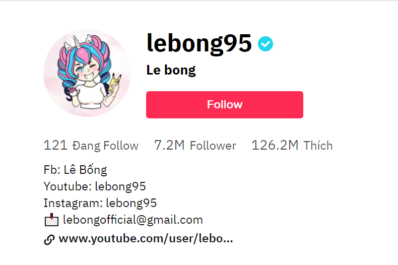 Chỉ sau ít năm làm tiktok, đến nay cô nàng đã thu về một lượng theo dõi 'khủng' mà nhiều người mơ ước. Tính đến tháng 8/2021, Tiktok của Lê Bống đã đạt hơn 7 triệu người theo dõi với hơn 126 triệu lượt thích.