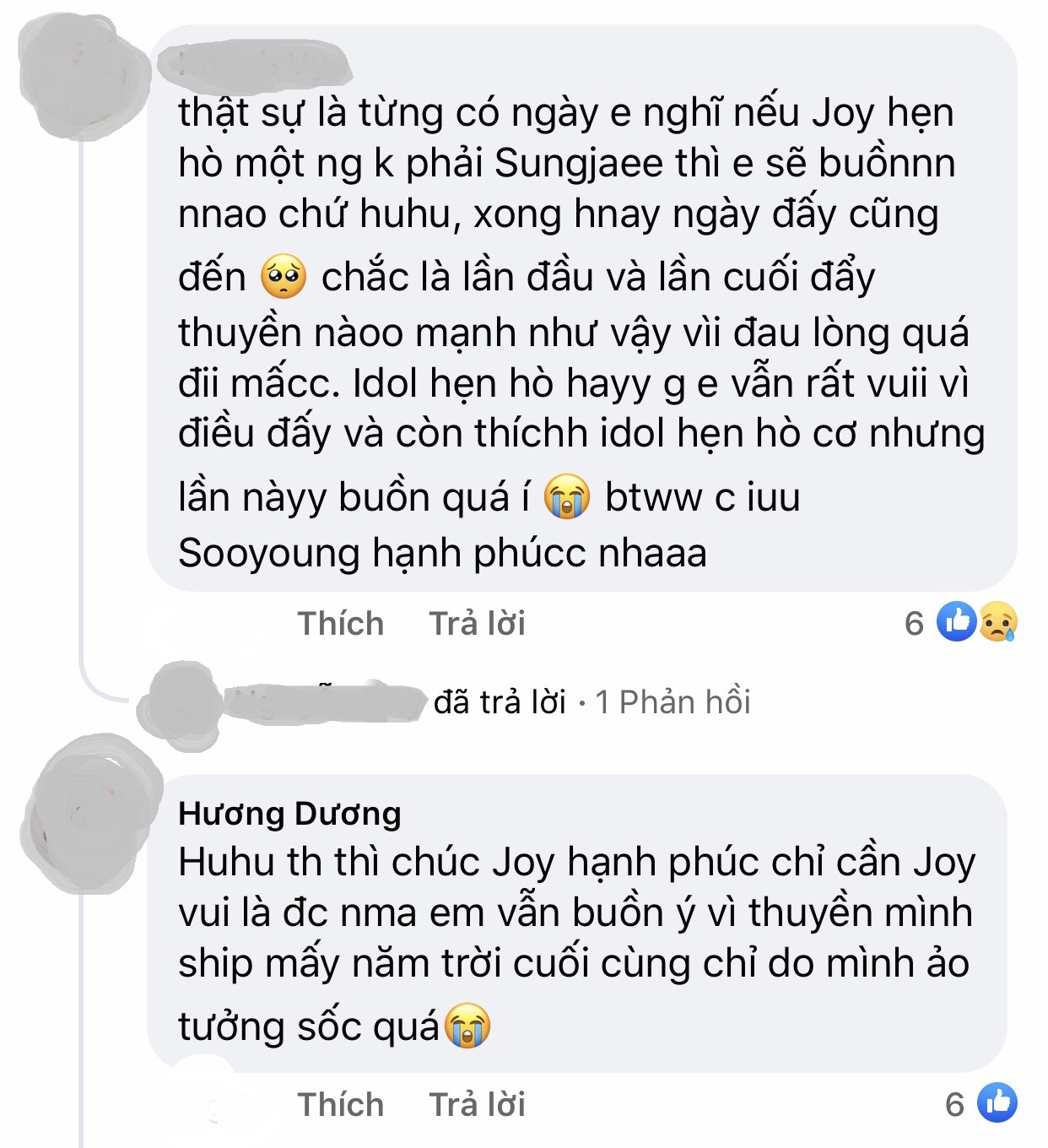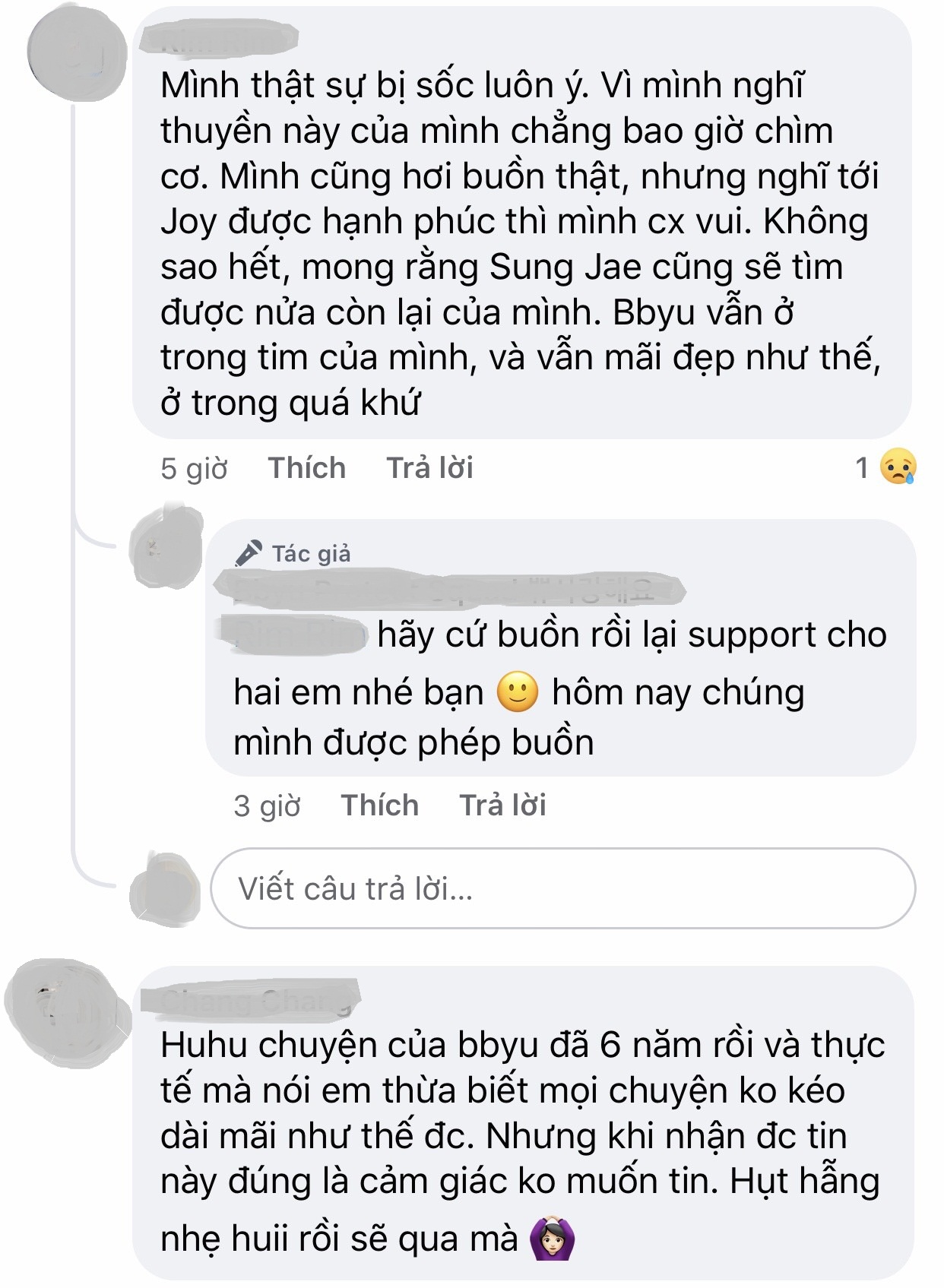 Tuy nhiên, sau nhiều năm “đẩy thuyền” miệt mài, fan hâm mộ của cặp đôi lại nhận được “tin dữ” từ thần tượng khiến nhiều người “không nén được nước mắt”. Một số dân mạng cho rằng, dù mừng cho Joy vì đã tìm được người yêu thương nhưng họ vẫn rất buồn vì đó không phải là SungJae.