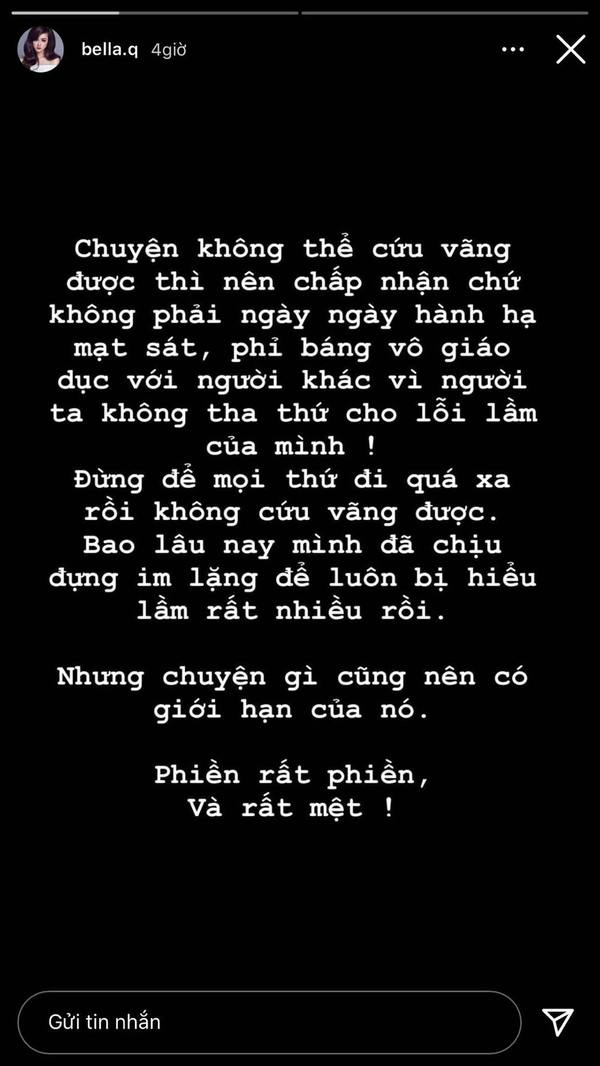 "Chuyện không thể cứu vãn được thì nên chấp nhận chứ không phải hành hạ, mạt sát, phỉ báng vô giáo dục với người khác vì người ta không tha thứ cho lỗi lầm của mình. Đừng để mọi thứ đi quá xa rồi không cứu vãn được. Bao lâu nay mình đã chịu đựng im lặng để bị hiểu lầm rất nhiều lần rồi nhưng chuyện gì cũng có giới hạn của nó", bạn gái cũ Karik bức xúc.