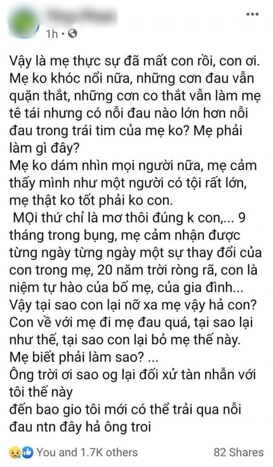 Vậy tại sao con lại nỡ xa mẹ vậy hả con? Con về với mẹ đi, mẹ đau quá, tại sao lại như thế, tại sao con lại bỏ mẹ thế này. Mẹ biết phải làm sao?