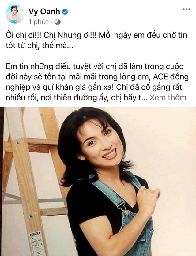 - "Đau lòng quá, một nghệ sĩ đa tài và có tấm lòng bồ tát luôn giúp đỡ mọi người cũng như nuôi dạy các con nuôi của mình. Em ra đi để lại trong lòng khán giả một tình yêu bao la rộng lớn, em đã phụ lòng khán giả nhưng không ai trách em đâu bao nhiêu người yêu thương em lắm. Chị xin chia buồn cùng gia đình của phi Nhung".