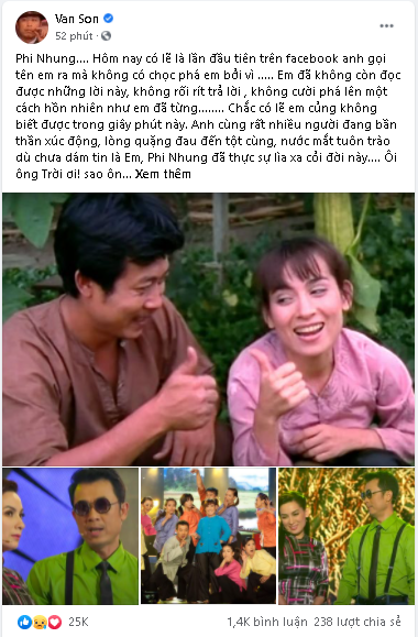 Từng có mối quan hệ anh em thân thiết với Phi Nhung, Vân Sơn không khỏi xót xa khi hay tin giọng ca "Chiều Lên Bản Thượng" vừa qua đời tại bệnh viện. Trên trang cá nhân của mình, nam danh hài chia sẻ: