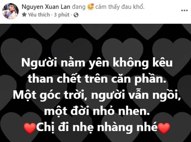 Nhiều sao Việt đã đăng tải bài viết chia buồn, tiễn biệt một người ca sĩ hết lòng với nghệ thuật; một người mẹ tận tâm chăm sóc hàng chục con nuôi; một người phụ nữ có cái tâm làm thiện nguyện, giúp đỡ người có hoàn cảnh khó khăn cho đến hơi thở cuối cùng.