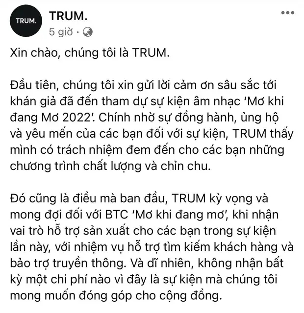 Đầu tiên, chúng tôi xin gửi lời cảm ơn sâu sắc tới khán giả đã đến tham dự sự kiện âm nhạc ‘Mơ khi đang Mơ 2022’. Chính nhờ sự đồng hành, ủng hộ và yêu mến của các bạn đối với sự kiện, TRUM thấy mình có trách nhiệm đem đến cho các bạn những chương trình chất lượng và chỉn chu.